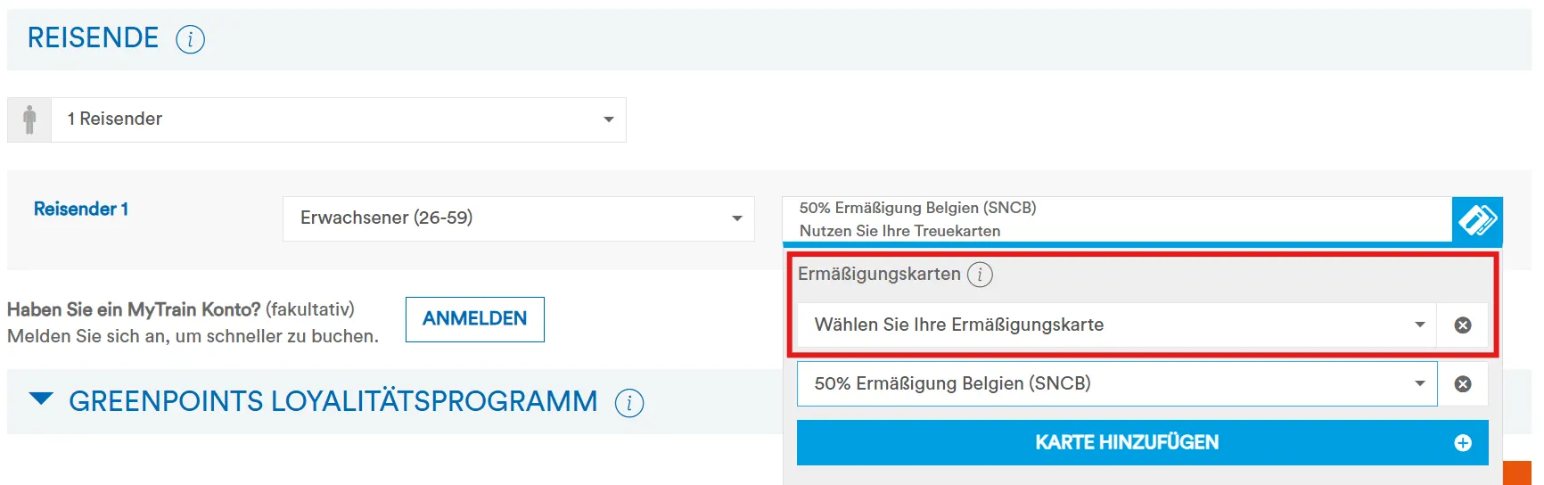 Die SNCB verkauft online Fahrkarten mit FIP 50 Rabatt bei grenzüberschreitenden Verbindungen in die Nachbarländer von Belgien. Dazu einfach bei den Reisenden die Ermäßigung “50% Ermäßigung Belgien (SNCB)” auswählen. Hier können auch mehrere Ermäßigungen, z. B. ein gleichzeitig noch vorhandener Freifahrtschein für die CFL (Luxemburg) oder NS (Niederlande) angegeben werden.